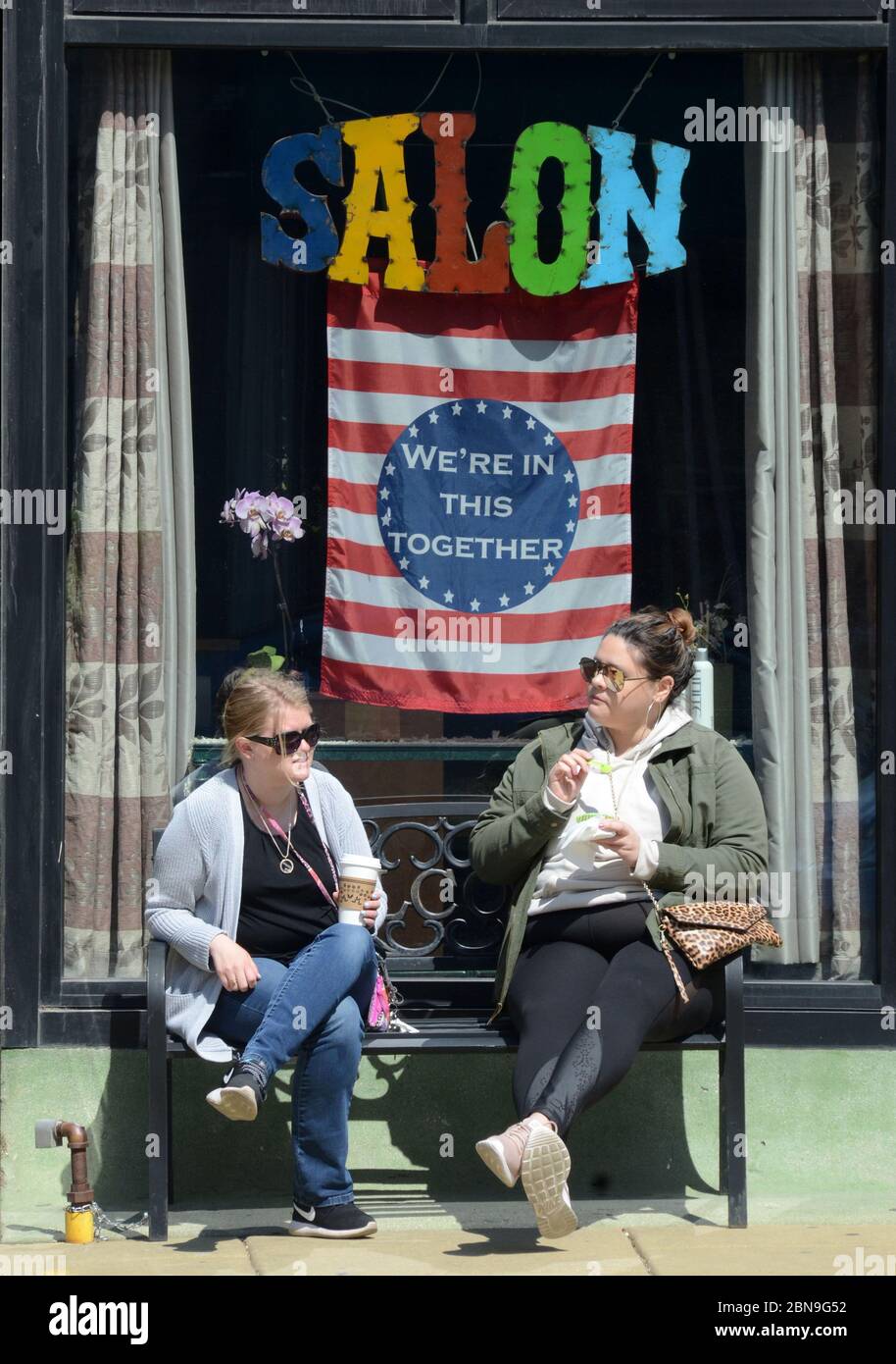 Racine Wisconsin Usa 13th May 2020 Alycia Johnson And Auriel Ackerman Chat In Front Of A Hair Salon On Main Street In Racine Wisconsin Wednesday Afternoon May 13 2020 Small Stores